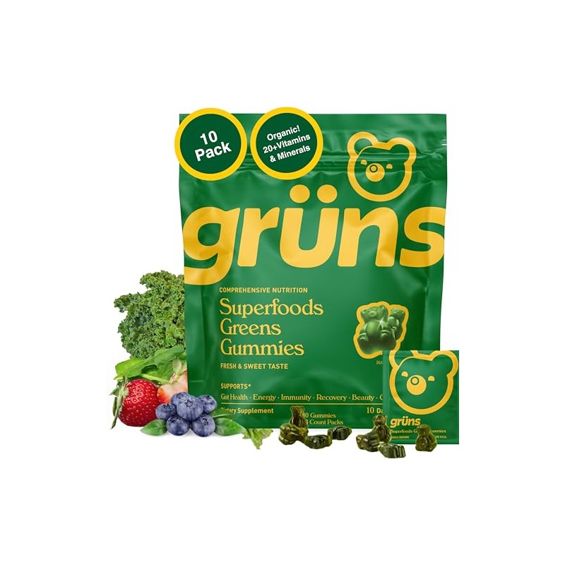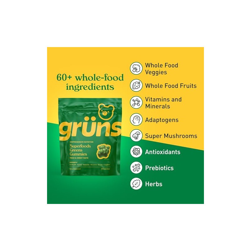 - Una multivitamina que llena los huecos: las gomitas Grüns Super Greens son un multivitamínico metilado cuidadosamente formulado con 60 potentes ingredientes orgánicos como frutas enteras, verduras, súper hongos, prebióticos y fibra, adaptógenos y más, para ofrecer una nutrición efectiva en un solo producto. Los ingredientes de esta gomita fresca y ligera con sabor a fresa/verde dulce pueden ayudar a mejorar tu salud intestinal, inmunidad y fortalecer la concentración mental