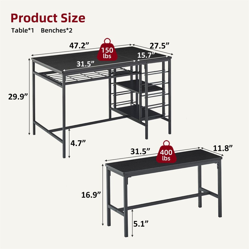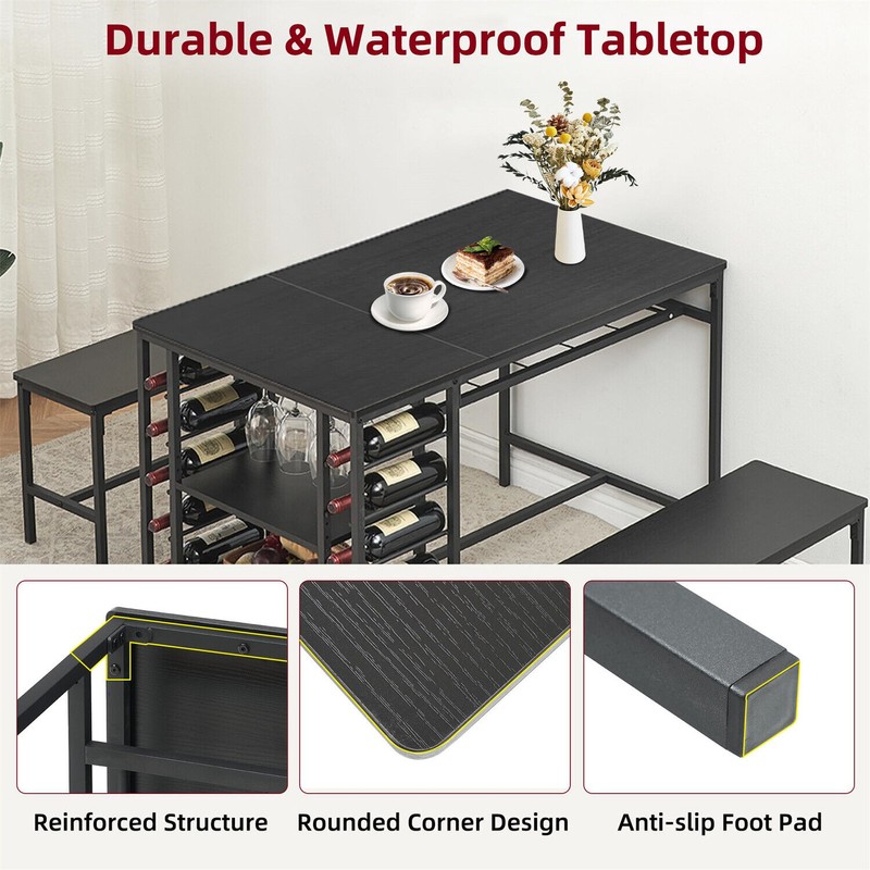 GRVEE Dining Table Set for 4 3 Pieces Kitchen Table Set W/2 Benches 2-Tier Wine Rack
