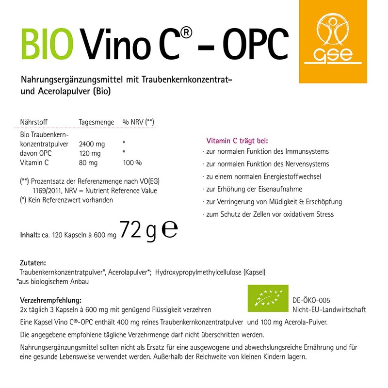 - BIO VINO C: Vino C liefert hochqualitatives Vitamin C und OPC aus Trauben- und Acerolaextrakt. Die Kombination aus bioaktiven Inhaltsstoffen kann antioxidative Prozesse im Körper unterstützen.