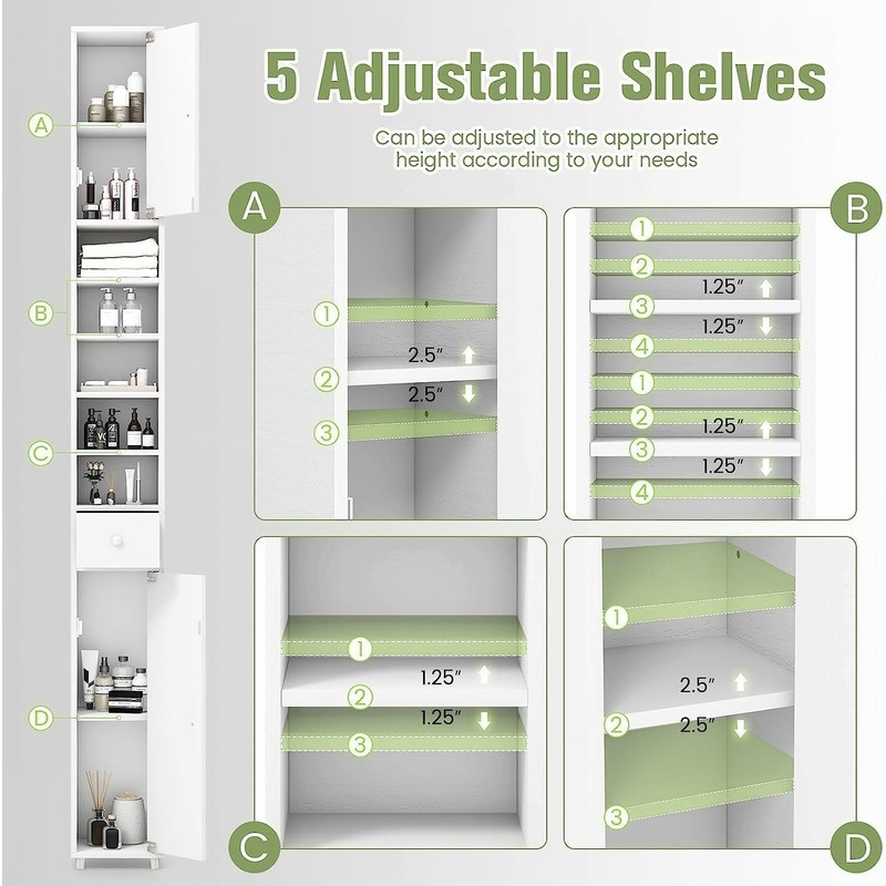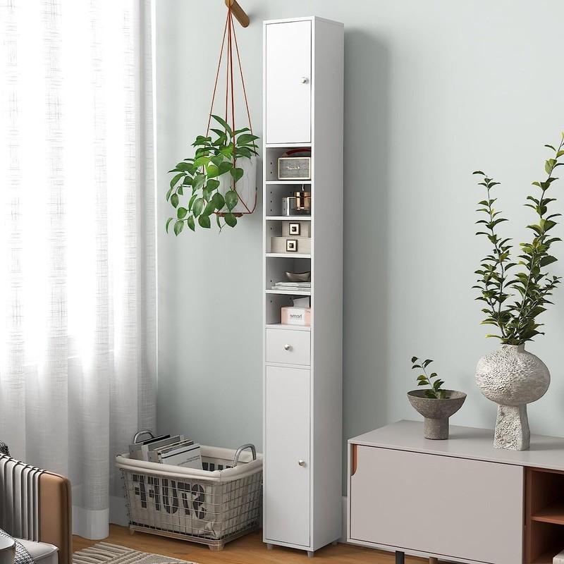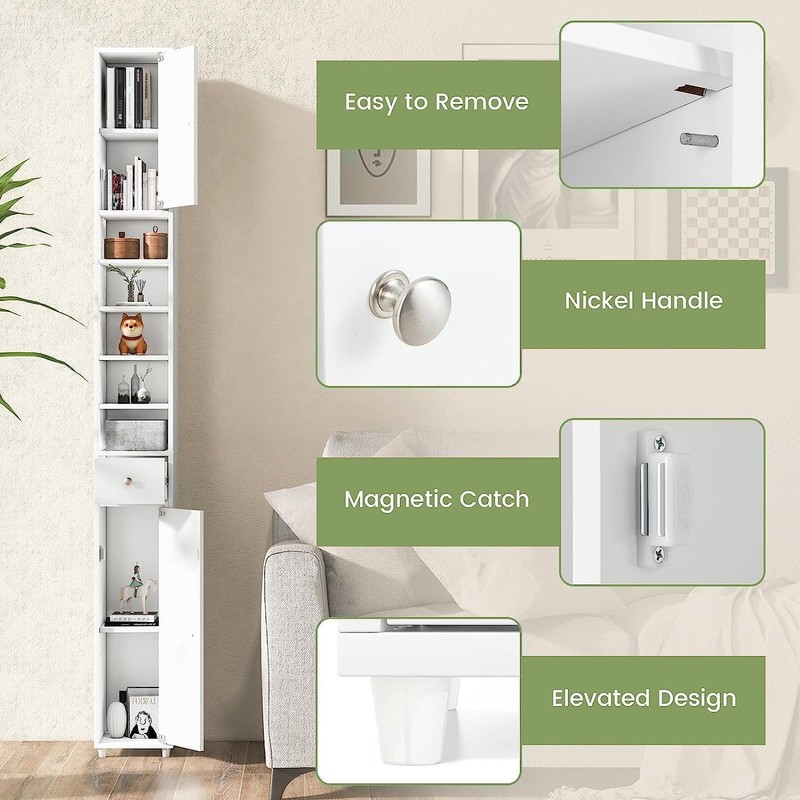 - 【Fit Perfectly in Tight Space】: With 8" x 8" length and width, this 71" tall linen tower makes the most of the vertical space in narrow area. Top and bottom cabinets are perfect for storing towels, taller shampoo bottles and detergents. The middle open shelves and the drawer help store small items such as toothpaste and toothbrushes.