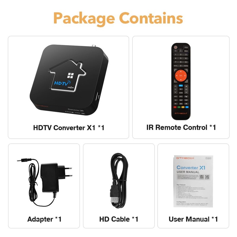 - What's in the BOX - 1X HDTV Converter X1, 1X IR Remote Control, 1X Adapter, 1X HD Cable, 1X User Manual