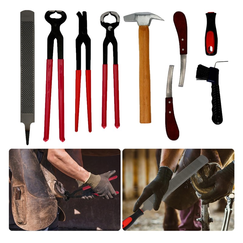 • Farrier Hoof Tool Kit: 8Pcs horse hoof trimmers kit includes 1 farrier hoof nipper, 1 horseshoe cutting pliers, 1 hoof nail clincher, 1 hoof rasp file with handle, 1 horseshoe brush (color random), 2 farrier hoof knife, 1 hoof hammer