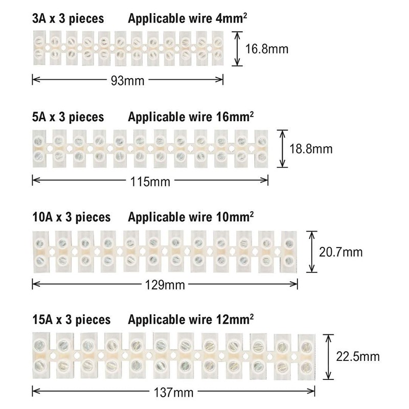 - Package contains: x12 Electrical Connector Strips (3 x 3 Amp, 3 x 5 Amp, 3 x 10 Amp, 3 x 15 Amp)