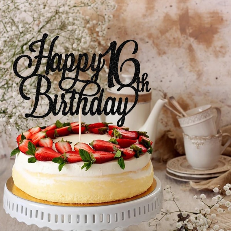 Gtseryeio - Decoración para tartas de cumpleaños 16 con purpurina negra, suministros para decoración de fiesta de cumpleaños 16 (16)