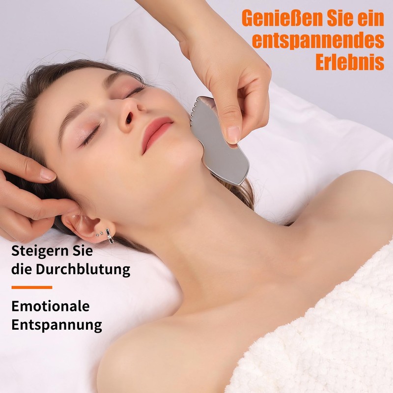 - Excellent and harmless material: the 100% stainless steel gua sha face care effectively reduces swelling thanks to excellent thermal conductivity - by cooling (fridge) for cold effects or heating (hot water) for heat treatment. Compared to jade, the material impresses with its higher safety, durability and a more pleasant feeling on the skin.