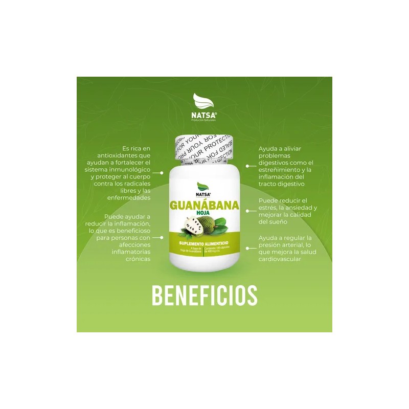 Disfruta los beneficios ancestrales de la hoja de guanábana en una fórmula práctica y de alta calidad. Conocida por sus múltiples propiedades naturales, la hoja de guanábana ha sido utilizada tradicionalmente como apoyo inmunológico, digestivo y antioxidante, convirtiéndose en un verdadero tesoro de la medicina natural.
