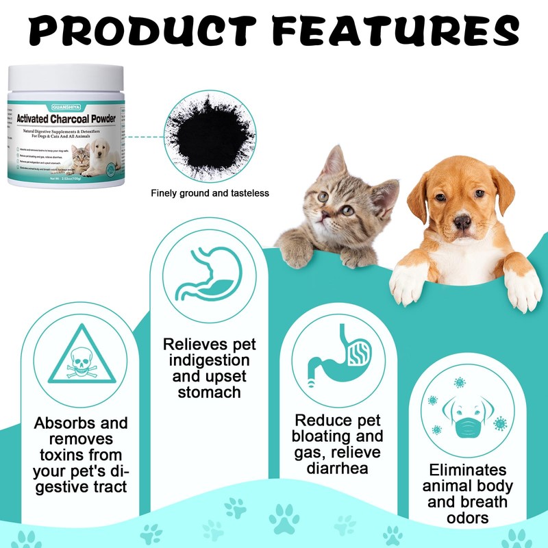 - Natural Digestive Aid - Activated charcoal powder is fine and lacks any smell, making it simpler to assimilate and digest compared to charcoal pills, capsules, or tablets. Activated charcoal for dogs for poisoning functions like a super sponge, absorbing chemicals or harmful substances and expelling them through feces, ridding the body of toxins. It aids animals in reducing bloating, and gas, and alleviating diarrhea and indigestion issues.