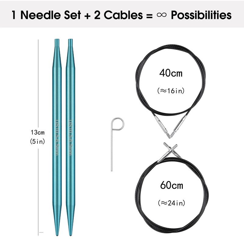 Guclud Interchangeable Circular Knitting Needle 16inch & 24inch Size US 10.5 (6.5mm) Aluminum Metal Knitting Needle with Cable for Hats, Socks, Baby Booties