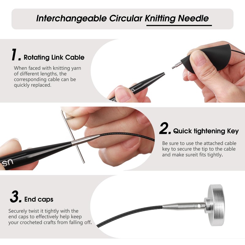 • Anti-Twisting Rotary Cables: The flexible, memory-free cables glide smoothly with your stitches and connect effortlessly to the tips, ensuring your knitting remains snag-free. Remember to utilize the included metal tightening keys to securely fasten the tips to the cables for a tight fit.