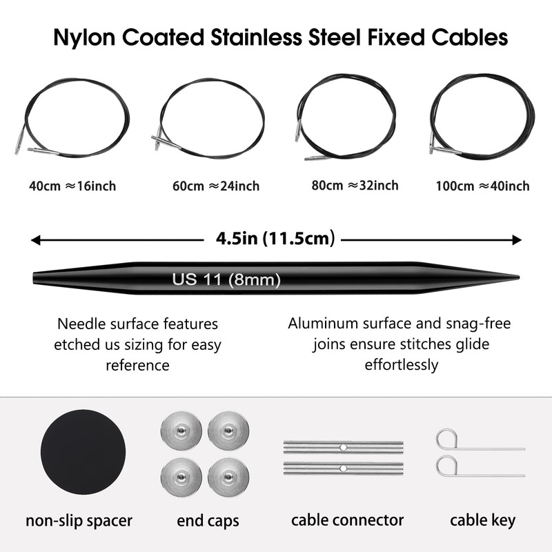 • 4-Length Interchangeable Cables: Circular knitting needles include cables in 16", 24", 32", and 40" lengths, providing versatility for a diverse range of knitting projects, from small to large.