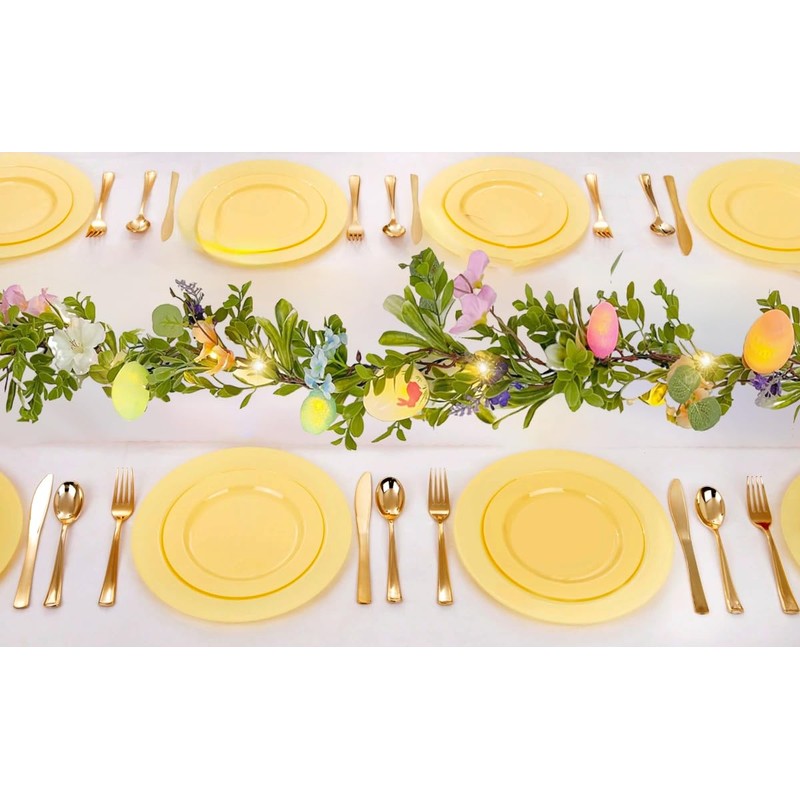 • Festive Flower Garland: Decorated with green, pink, blue, and white Easter eggs in various shapes and sizes, adding a fun and celebratory touch