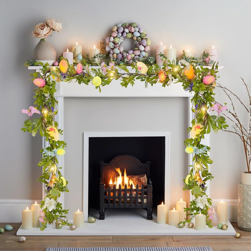 Gudegou 6FT Easter Garland for Mantle, Spring Garland with Eggs Flowers, Lighted Faux Greenery with Timer for Summer Fireplace Outdoor Decorations