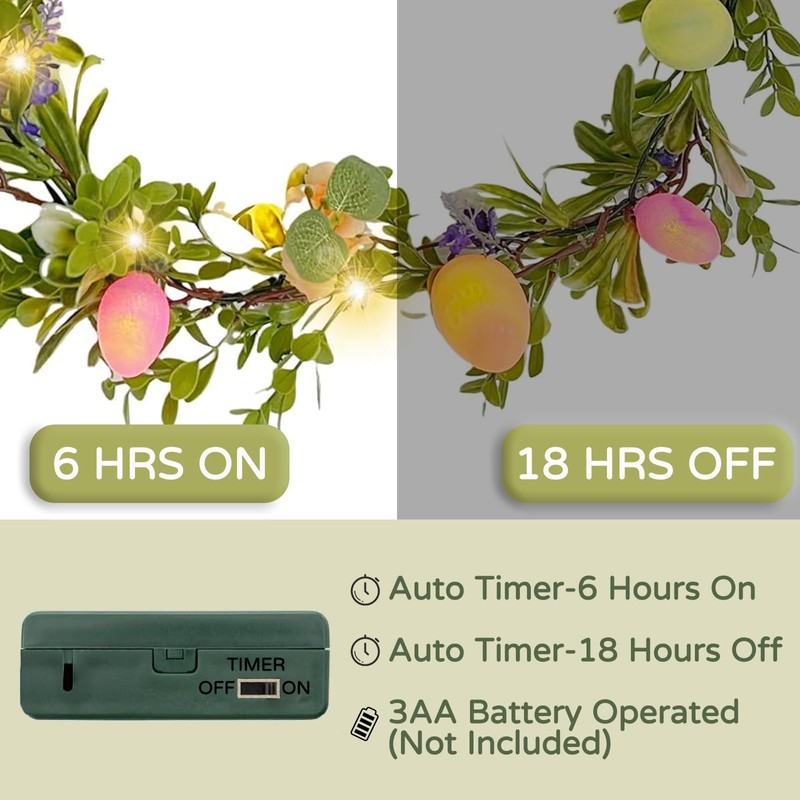 Bring the beauty of spring indoors with our 6FT Easter Lighted Garland! This lush and vibrant garland features a mix of three green pine leaves, accented with pink, white, blue, and lavender flowers for a natural, full look. Wrapped with a 20-LED light string (powered by 3 AA batteries, not included) and decorated with green, pink, blue, and white Easter eggs in various shapes and sizes, this garland adds a festive touch to any space. The built-in timer function (6 hours on, 18 hours off) makes it energy-efficient and easy to use. Perfect for Easter, spring, or summer decor, this garland is ideal for mantels, tables, doorways, or walls, creating a warm and inviting atmosphere for any occasion.