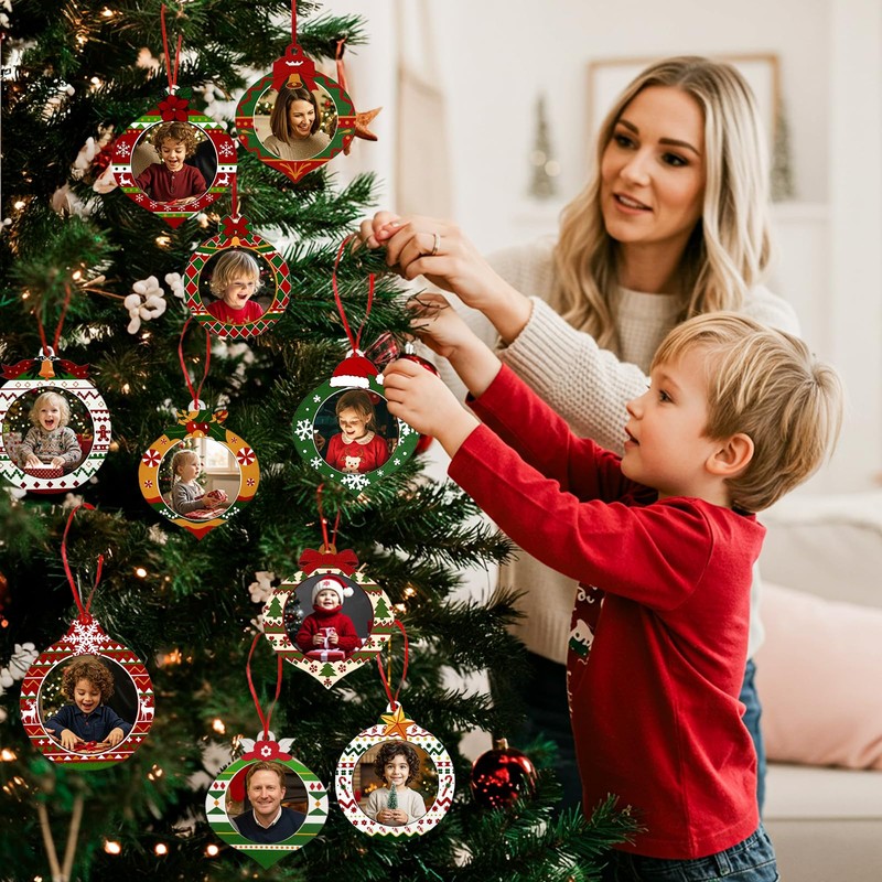 - 🎄 Wooden Christmas Ornaments: This set includes 24 photo frame ornaments in 12 festive Christmas ball designs (6 round and 6 teardrop shapes), plus plenty of red hanging ribbons. With a variety of classic Christmas elements, these picture ornaments are perfect for decorating trees, windows, mantels, or party spaces with personalized memories.