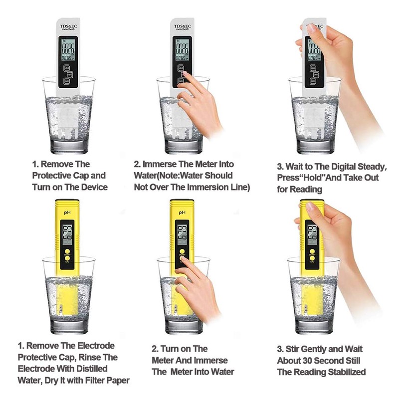 • THE RANGE OF MEASURE: PH resolution is 0.01pH, accuracy is ±0.01pH, measurment range is 0-14 pH. TDS meter ranges from 0~9990ppm, Conductivity ranges from 0~9990 us/cm, EC ranges from 0~9990 us/cm