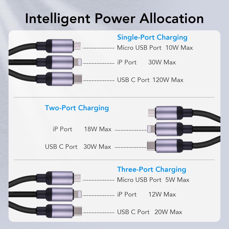 - 【120W Ultra-Fast Triple Charging】Charge 3 devices at once with a total output of 5A/66W. Single-port support: up to 120W (USB-C), 30W (iOS-compatible), and 15W (Micro). This versatile USB to USB C cable powers laptops, tablets, and smartphones with lightning-fast speed—ideal for busy lifestyles and multitaskers