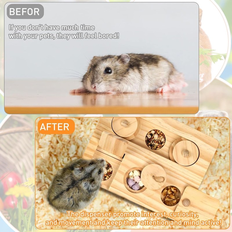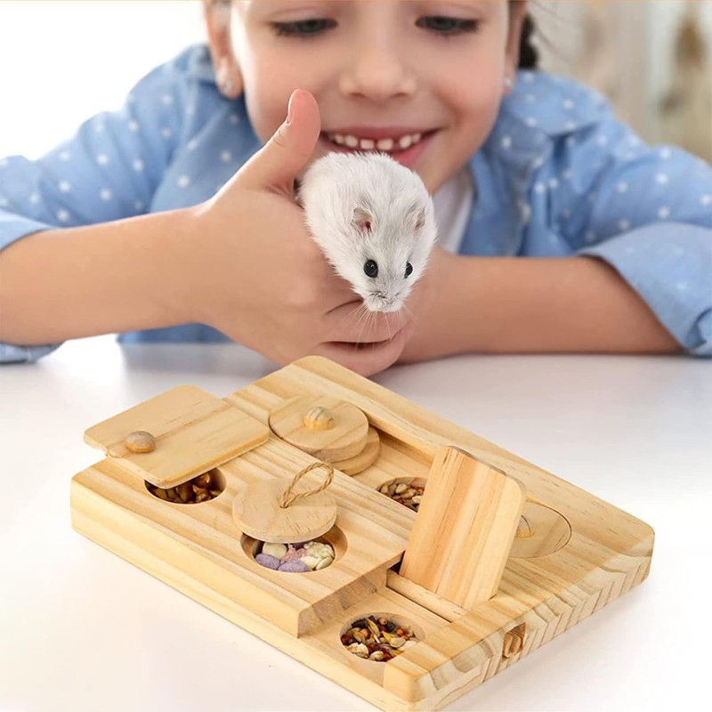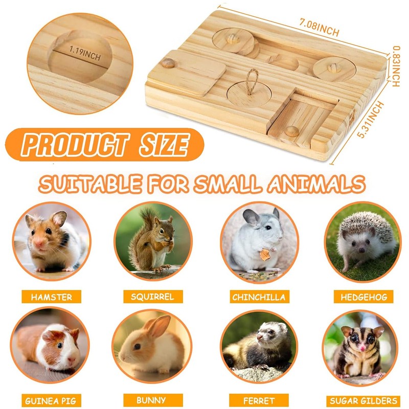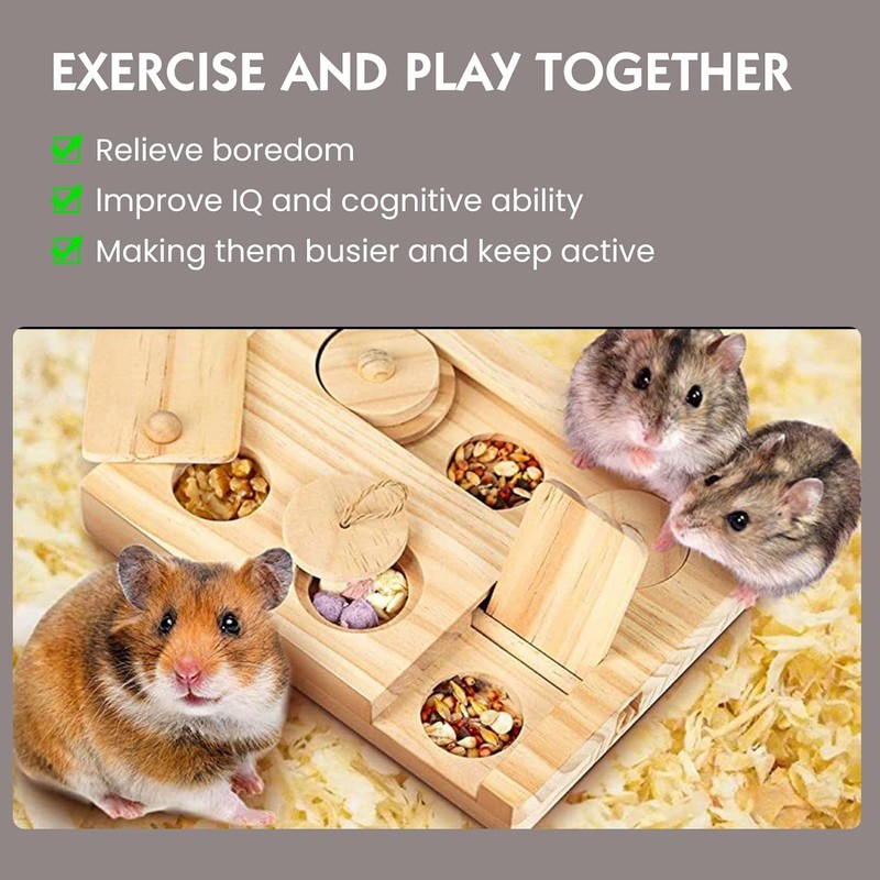 - Interactive enrichment toys: Our hamster toy is developed with more challenging skills. rovides a fun physical and mental challenge for hamsters. Trainning pets sense of smell, thinking ways to solve problems, also the interactive game for chinchillas, to enjoy the fun feeding when they move with the nose or paws to move the sliders. Small animals absolutely love this stimulation activity.