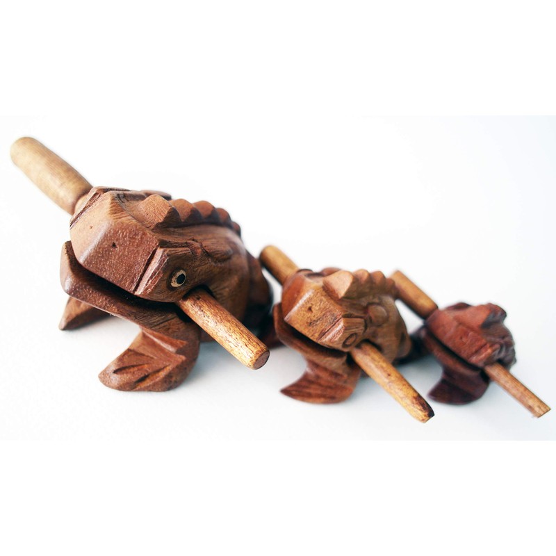 - Size and material: 5 cm./ 2", 8 cm./ 3", 10 cm. / 3.5" (measured from the mouth to the tip of the hind leg) This musical instrument is a natural wood product by drilling a hollow in the middle to make its sound. You will enjoy its fresh chime. It is a musical instrument that miraculously mimics the sounds of frogs in nature. And if you play many of them at the same time, it will be like hearing the frog families singing in front of your front yard.