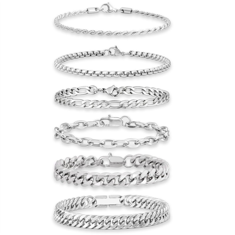 GUJOXILA Men's Bracelets, Stainless Steel Bracelets, Silver, Black, Gold, 19 cm/21 cm/23 cm, Length for Hip Hop Rapper, Gifts for Husband, Dad, Son, Pack of 6, 21 cm