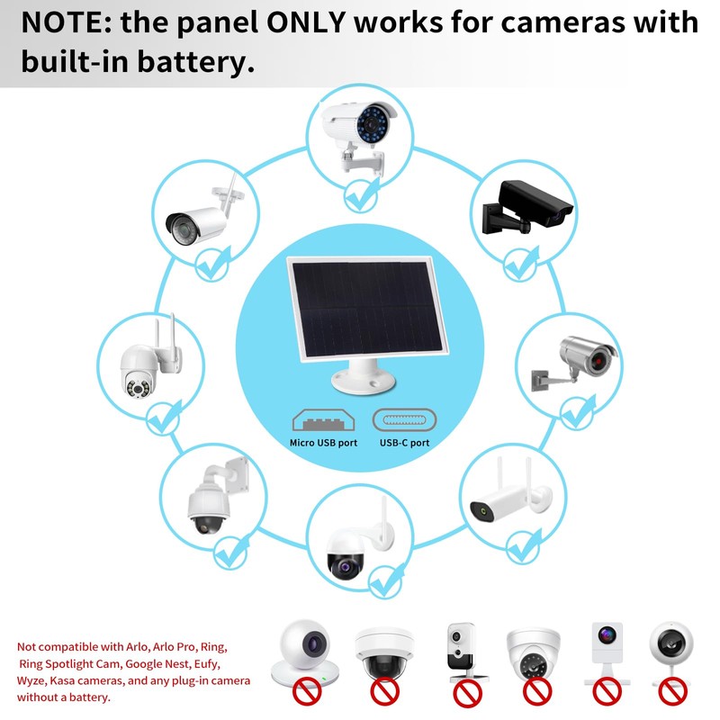 - Compatible with Micro USB & USB -C Port6-watt solar panel is compatible with a micro USB & USB -C port camera, Not compatible with Arlo, Arlo Pro, Ring, Ring Spotlight Cam, Google Nest, Eufy, Wyze, Kasa cameras, and any plug-in camera without a battery.