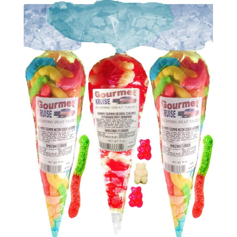 Gummy Worms (2) Neon Sour Worms (1) Red Wild Cherry White Strawberry Banana Gummi Bears (NET WT 31 OZ) Gourmet Kruise Signature Gift Bags