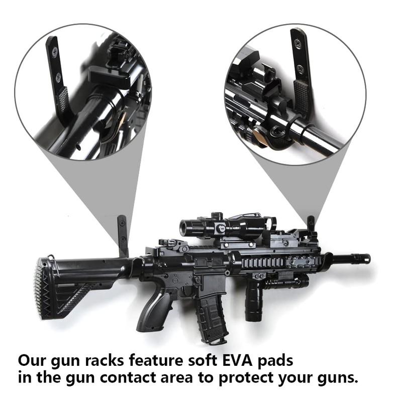 Our gun racks for wall are constructed of high-quality carbon steel that is both durable and long-lasting. The gun wall hanger stand is very sturdy so even heavy items can hang without worry of falling. And the soft EVA padding can protect your guns from unwanted scratches.