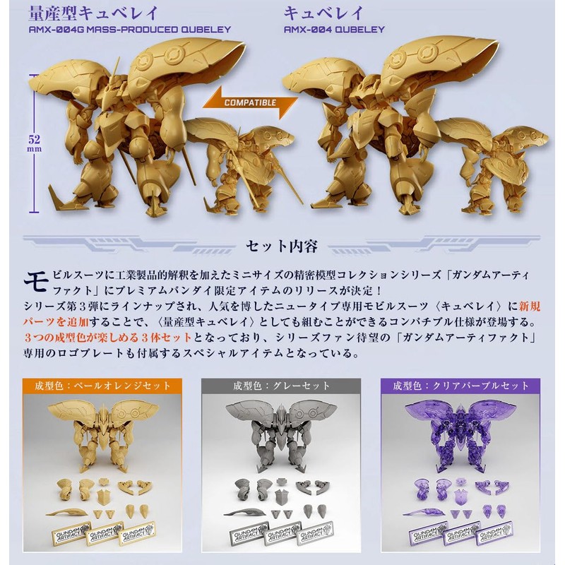 - This is the first premium Bandai limited edition product in the Gundam Artifact series. This is a 3-piece set with parts that can be replaced into a mass produced cuberay based on the 3rd series lineup. The molded colors are available in the series "Pale Orange" and "Gray" and "Clear Purple" (1 of each). 9 logo plates with 1 gum