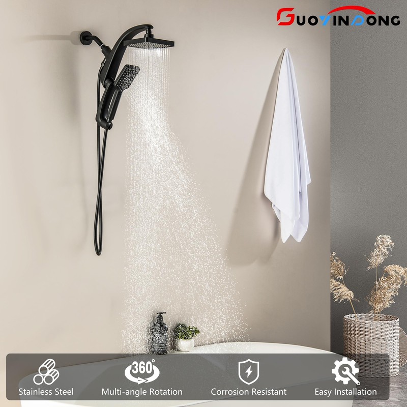 GUOYINDONG High Pressure Dual Shower Heads, Square Rain Shower Heads with Handheld Spray Combo Double Shower head with Adjustable 3-Function Arm, Matte Black