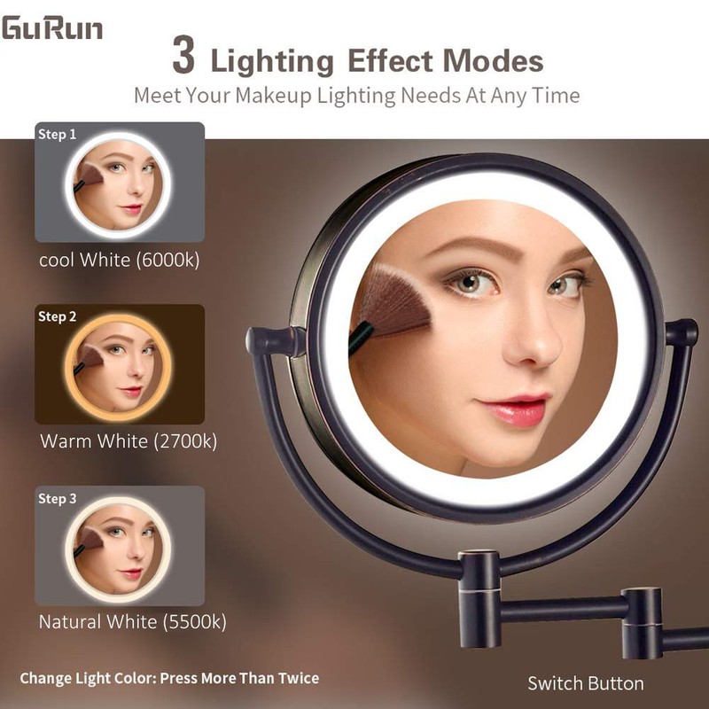 - LED Light with 3 Color Modes- Our GURUN 1809D mirror has 3 color lighting---- Natural Daylight, Warm Yellow, Cool Light---- adjusted by pressing the button on the base more than twice, 50 LEDs in total for 3 color lighting. 25 LEDs illuminate in one time.