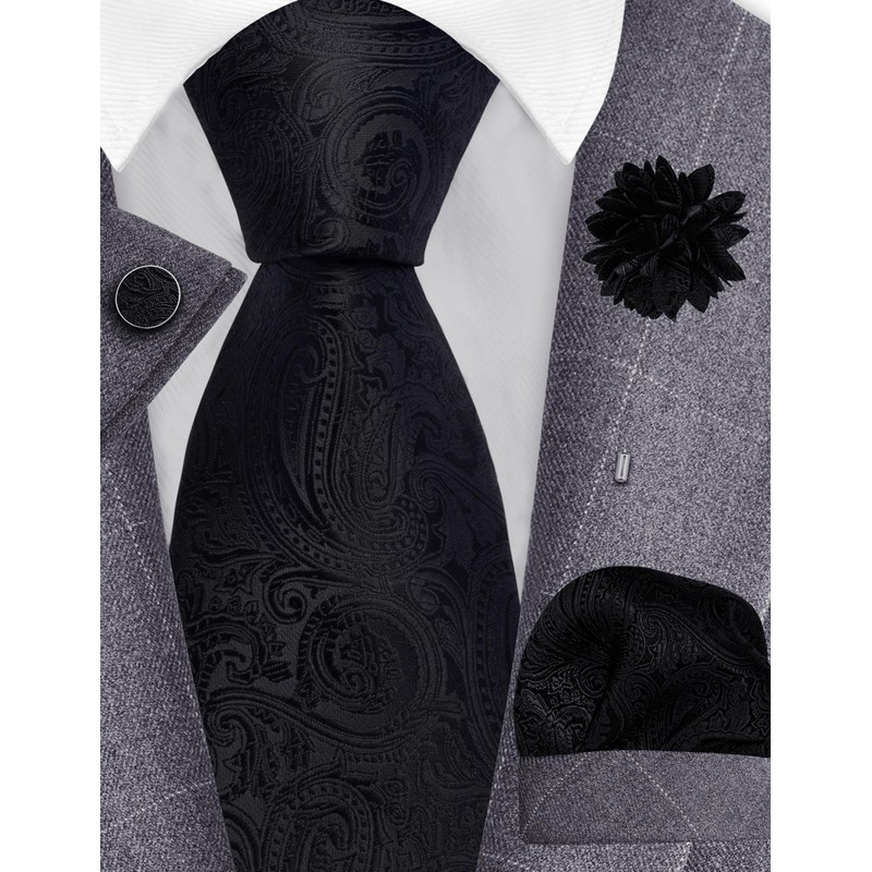 GUSLESON Mens Black Tie Paisley Wedding Solid Silk Necktie Pocket Square Cufflinks and Lapel Pin Brooch Set (6103-09)