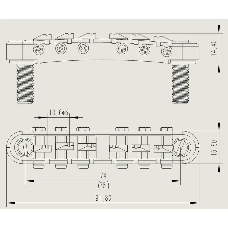 - Bridge Size (L x W): Approx. 91.8mm x 15.5mm, String Spacing: Approx. 10.6 mm / 0.42 in, Bridge Post distance: Approx. 74mm(75mm).