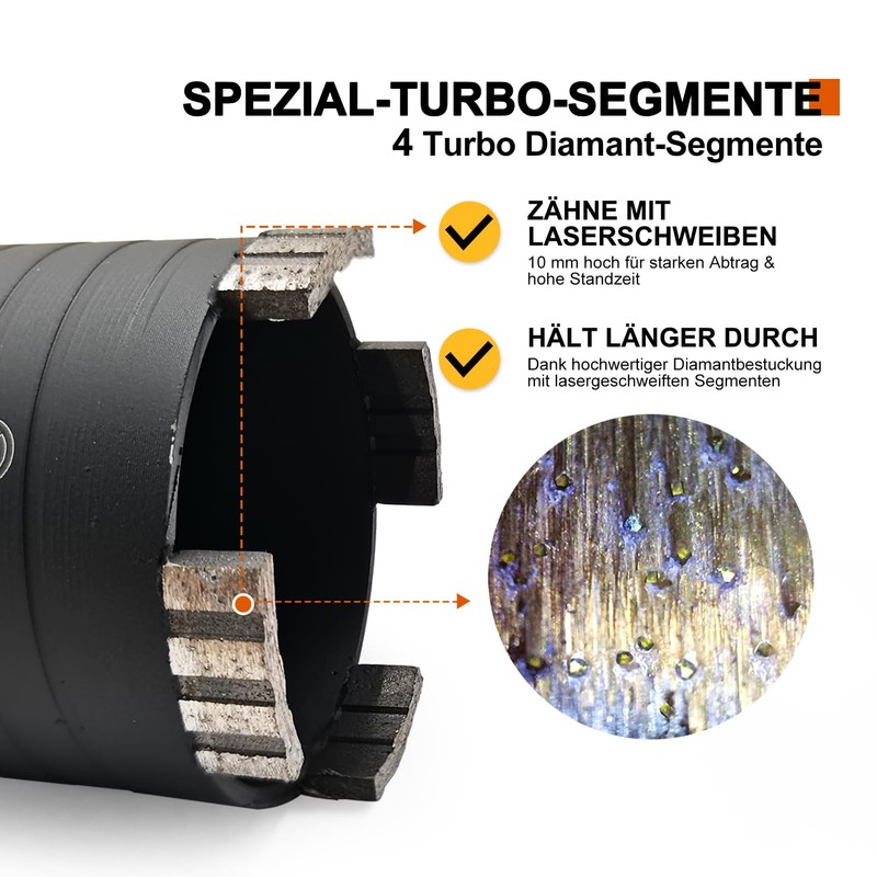 • Easy to use: drill bit socket has 4 special turbo segments, the segment height is 10 mm