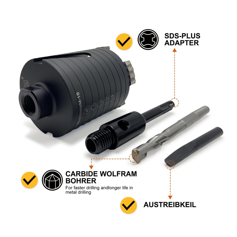 • SDS Plus mount: 68 mm socket countersink compatible with all standard drills and hammer drills with SDS-plus drill chuck; please note the maximum rotation speed of 850 rpm when working and use without impact function