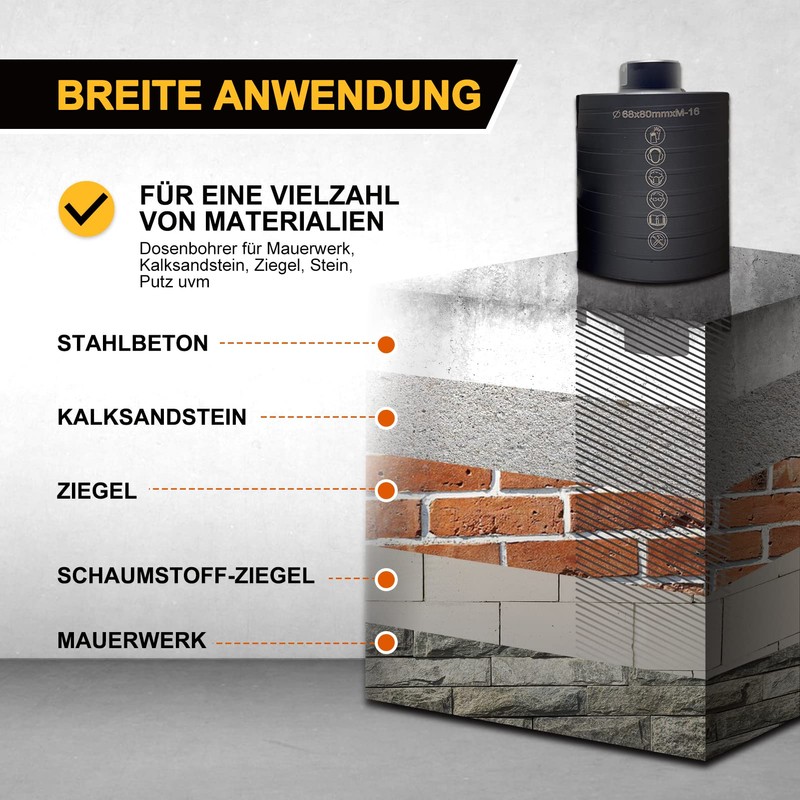 • Application: the high-quality heat-resistant diamond grain formula of the can drill is suitable for effective dry drilling in concrete, reinforced concrete and abrasive concrete products, solid brick, hollow brick, masonry, sand-lime brick up to density of 2.0 kg/dm³, plaster, poroton, natural stone, artificial stone