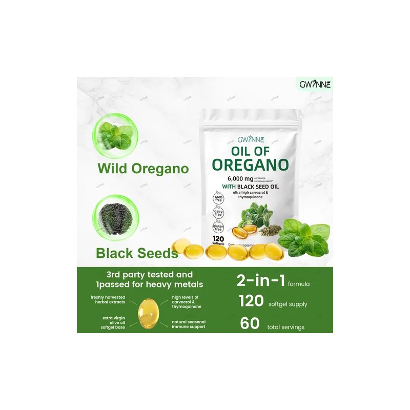 GWYNNE Micro Ingredientes Aceite de hoja de orégano Cápsulas blandas 6000 mg por cápsula (1 cápsula/120 cápsulas)