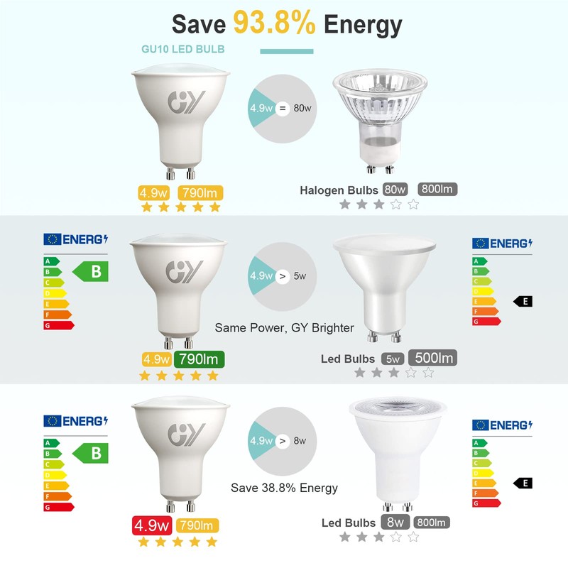 - More energy-efficient LED bulbs - GY GU10 LED bulbs are class B energy efficient, far better than other EF energy-efficient bulbs, with a power of 4.9 W, more than conventional bulbs 5 W/6 W/7 W/8 W, replace 80 W halogen bulbs, save up to 93.8% of the cost of electric lighting. According to calculation comparison, the 80 W halogen bulb can only last 12.5 hours for one degree of power consumption, while the GY 4.9 W LED GU10 can last 204 hours.