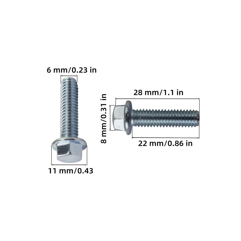 • Screw length: 28 mm /1.1 in; Thread length: 22 mm /0.86 in; Thread diameter: 6 mm /0.23 in; Thread spacing: 1 mm /0.03 in; Diameter of plane contact surface: 11 mm /0.43 in; Weight: 6 g/0.013 lb.