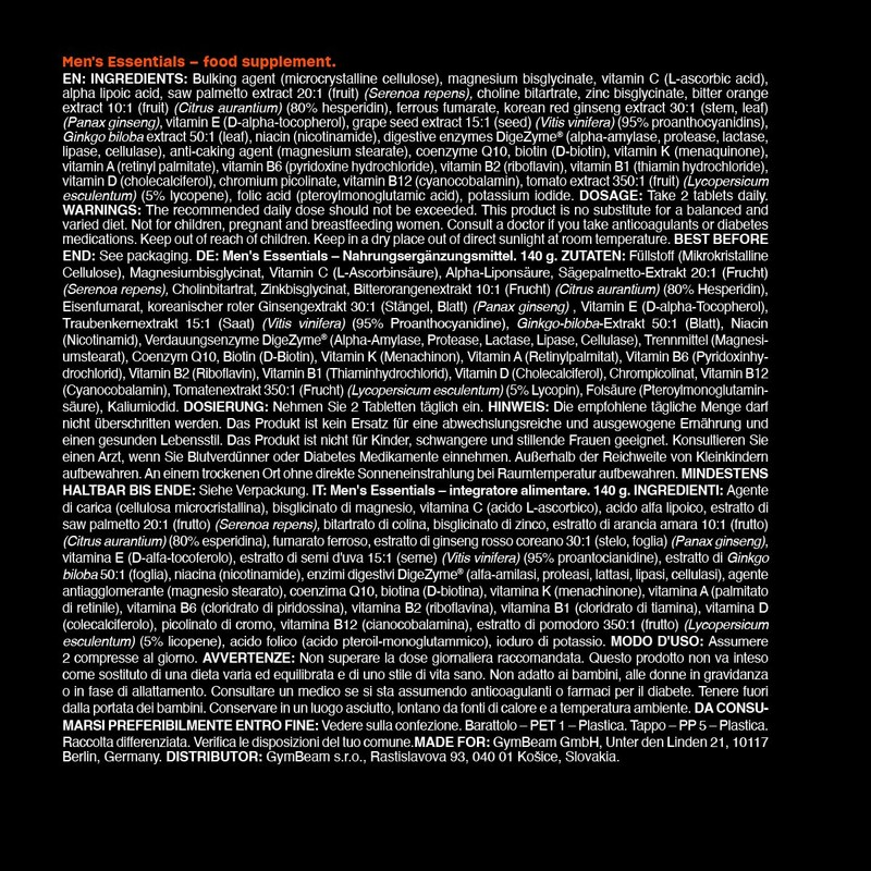 GymBeam GymBeam Men's Essentials Vitamin und Mineralienkomplex - Nahrungserg?nzungsmittel, komplexes Multivitamin speziell fr M?nner entwickelt, Tabletten mit 27 Inhaltsstoffen, 120 tabs
