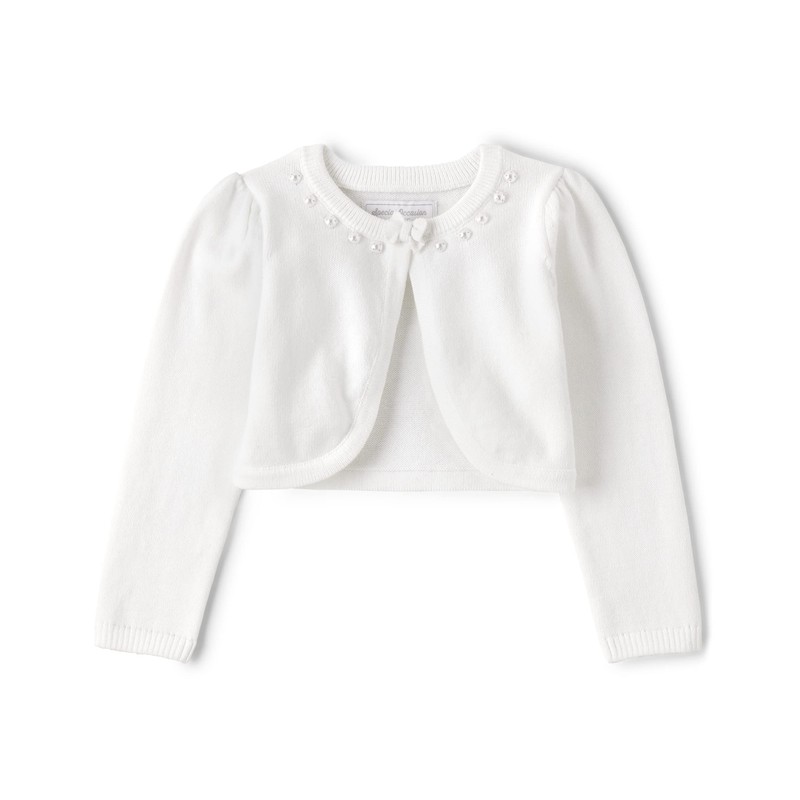 • CARDIGAN — Faux pearls and a bow make this cardigan perfect for layering over all of her dressy looks!