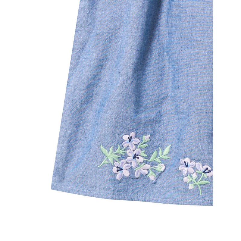 - DESIGN — Features embroidered flowers, ruffle trim neck and smocked bodice