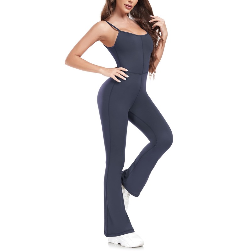 - Este overol acampanado es una pieza de longitud completa con un escote cuadrado en la parte delantera y tirantes delgados ajustables que son sexy.