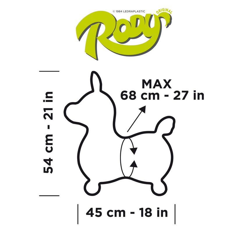 - Durable Material - Made from strong, latex-free and phthalate-free vinyl, its elasticity provides the best riding experience. Rody measures 12" high at the saddle, with a recommended weight of 45 kg (100 pounds).
