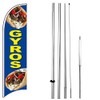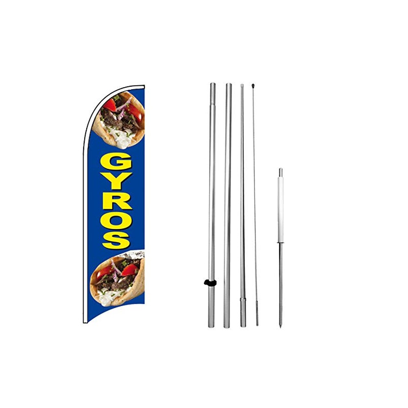 GYROS Windless Feather Swooper Flag Kit. Complete kit: 11.5 Ft Tall flag Aluminum pole, approx 15ft Ground spike Windless flag doesn't need wind to fly fully.