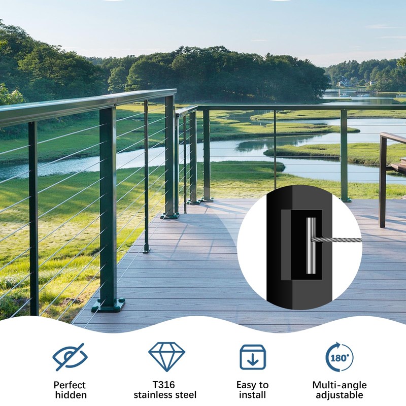 - T316 Marine Grade: Our T316 stainless steel cable railing hardware is sturdy, rust-resistant, and corrosion-resistant. It is suitable for use in indoor, outdoor, and coastal applications. The 1/8" invisible cable railing kits are easy to install and maintain tension, preventing wire rope damage.