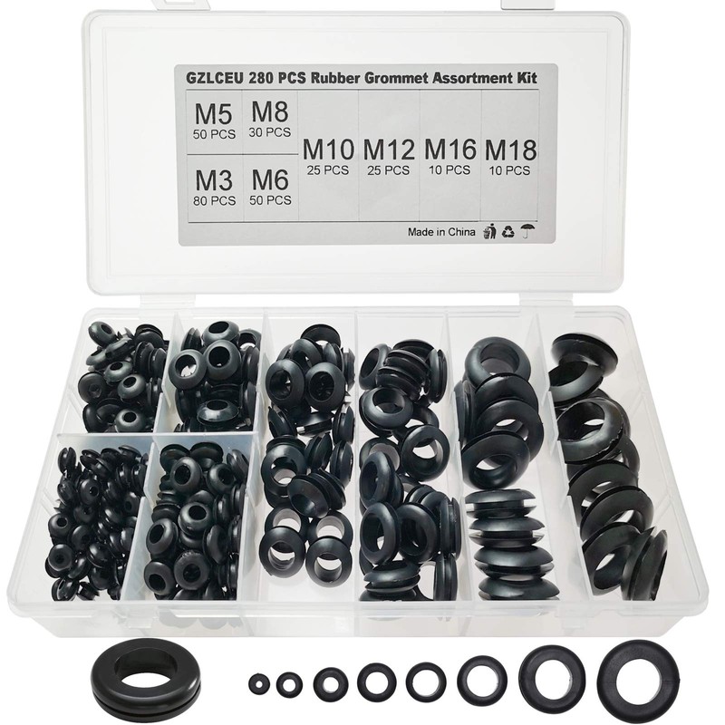 • You will receive: a total of 280 pieces cable grommet rubber and a plastic box, there are 8 sizes: M3 x 8.2 x 3.0 mm, 80 pieces, M5 x 11.0 x 50 mm, 50 pieces, M6 x 12.3 x 5.5 mm, 50 pieces, M8 x 15.0 x 6.2 mm, 30 pieces. ,M10*17.0*7.3MM-25PCS,M12*21.5*7.5MM-25PCS,M16*25.5*9.0MM-10PCS, M18*28.0*9.5MM-10PCS.