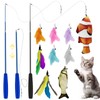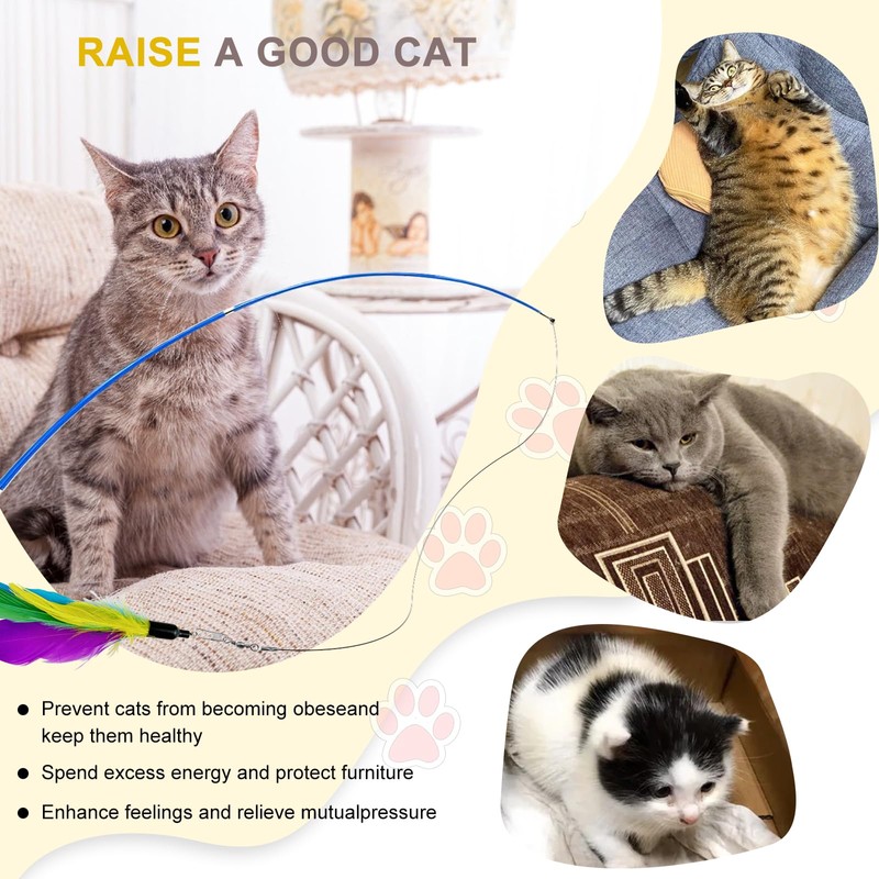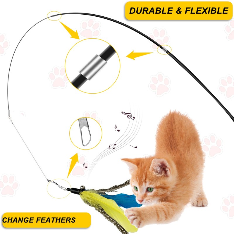 - Freshness for cats: the cat fishing rod is easily replaceable, the beautiful feathers and the realistic fish toys are enough to delight the cats. All feather baits have bells that can awaken the cat's interest and stimulate their instinct.