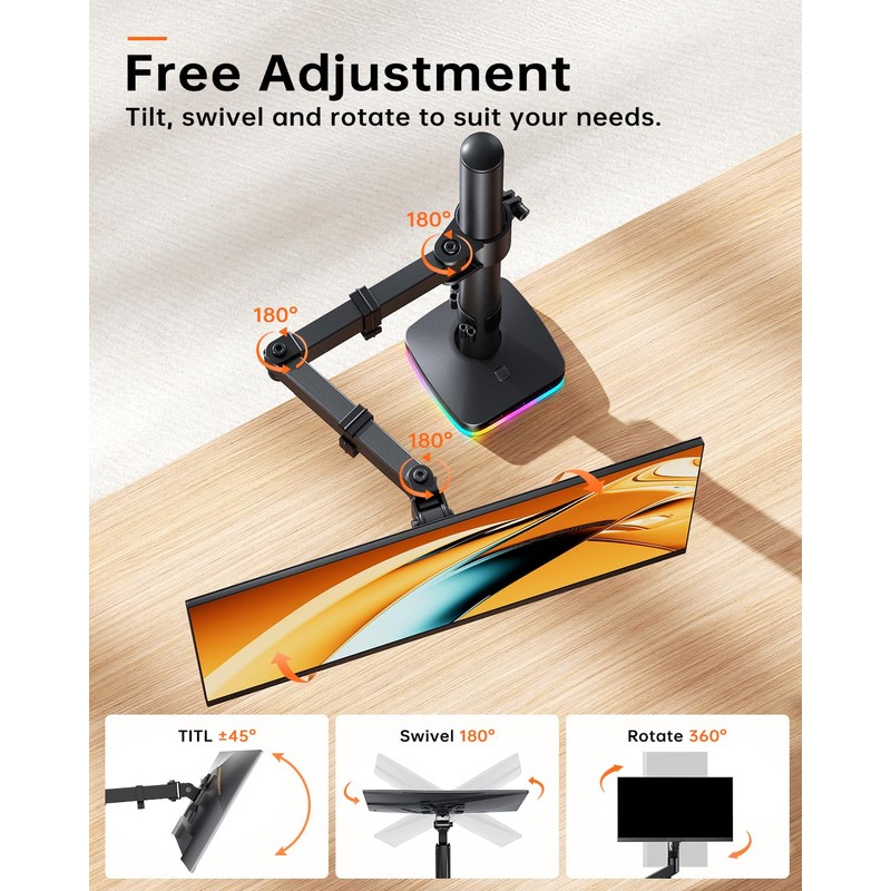 - [Various RGB lighting Effects]: The RGB lighting design of this monitor mount can be turned on in entertainment mode and turned off in work mode, with a variety of dynamic lighting effects, allowing you to immerse yourself in a colorful world