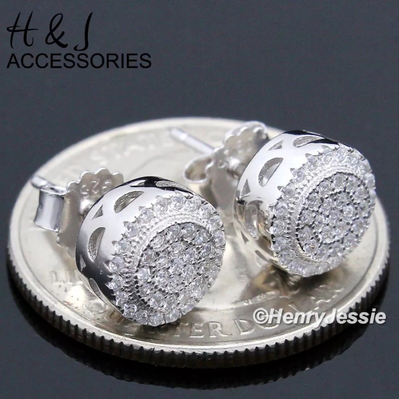 H&J Jewelry MEN SOLID 925 STERLING SILVER 8MM ICY BLING CZ 3D ROUND STUD EARRING*AE150
