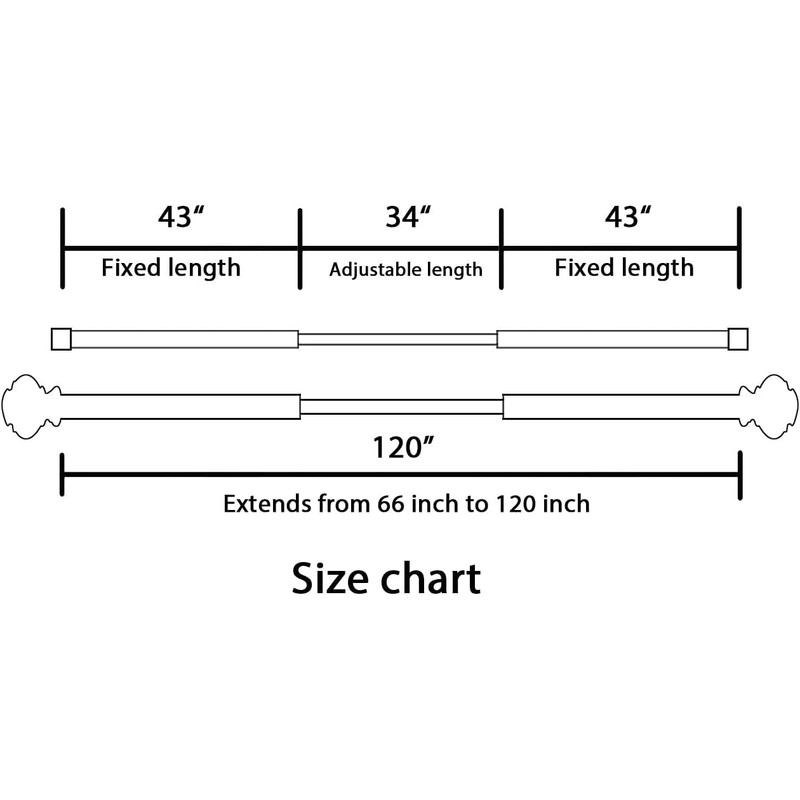 - ADJUSTABLE LENGTH: This decorative double curtain rods can adjust from 66 to 120 Inches, 3/4-Inch diameter on front rod, 5/8-Inch diameter on back rod