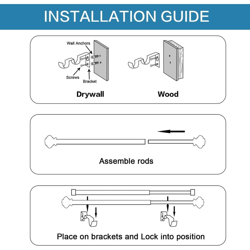 - ENTIRE SET: Installation instructions included, well package with 1 set of high quality of steel double window curtain rods, 2 resin finials, 2 end cap finials, 3 durable mounting brackets, and other hardware